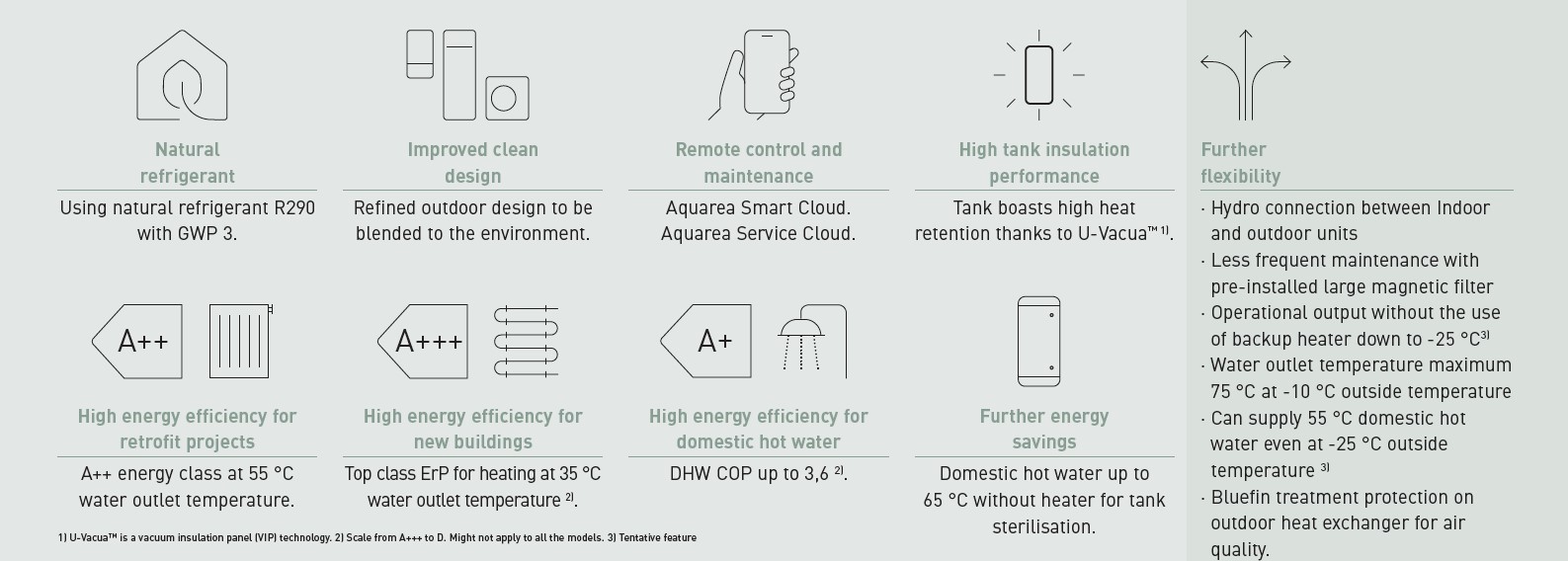 - Augsta karstā ūdens energoefektivitāte. Karstā ūdens apgādes COP līdz pat 3,62.