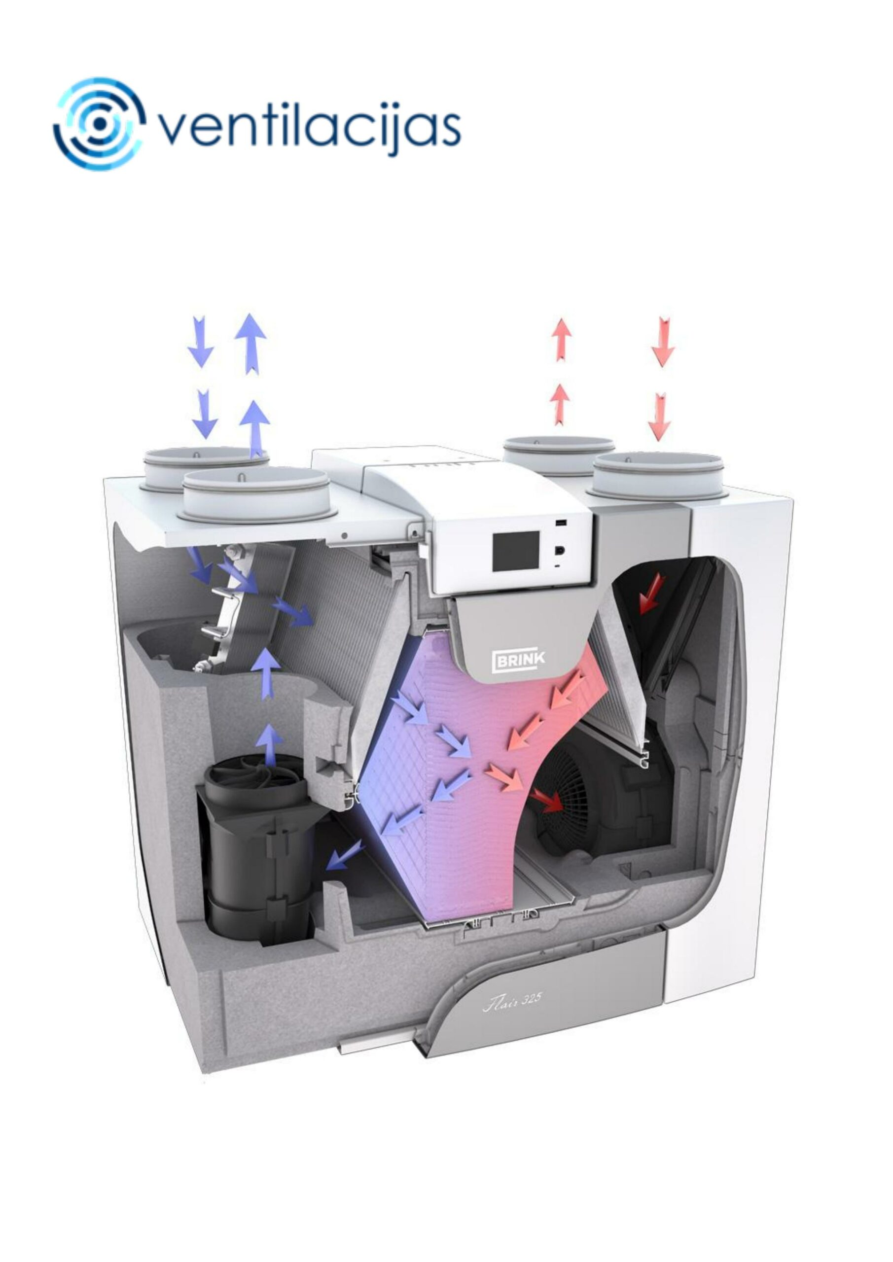 Izmēri: P 750 x A 650 x Dz 560 (mm) Gaisa vada pieslēgums: 180 mm Gaisa plūsma (pie 250 Pa): Maks. 400 m3/h Lietošanas diapazons no 50 m³/h līdz 400 m³/h Temperatūras efektivitāte PHI*: 92,1% Iebūvēts gaisa apvadvārsts (bypass) Iebūvēts āra gaisa priekšsildītājs: 1000w * PHI = Passive House Institūta sertifikāts BRINK Priekšrocības: Plašas vadīšanas iespējas Lietderīgi uzstādīšanas un apkopes norādījumi Optimāls līdzsvars starp termālo efektivitāti un enerģijas patēriņu Īpaši klusa darbība Jauns ventilācijas standarts ar siltuma reģenerāciju Brink Flair 400 ir ļoti efektīva ventilācijas iekārta – un nodrošina vajadzīgo svaigā gaisa daudzumu jebkurā laikā un jebkurā situācijā. Kombinācijā ar jaunajiem sistēmas moduļiem mitrināšanai, tīrīšanai, apkurei un dzesēšanai tas rada lielāku komfortu un veselīgu iekštelpu klimatu. Jauns standarts Brink Flair 400 ir pirmā ierīce no Flair sērijas, un tās maksimālā jauda ir 400 m3 / h. Runājot par veiktspēju, ērtu uzstādīšanu un savienojamību, šī ierīce ir priekšā savam laikam. Tas nozīmē jaunu standartu ventilācijā ar siltuma reģenerāciju. Īpašs pakalpojumu klāsts Visi Flair 400 elementi ir pilnībā pārveidoti. Ģeniālā kombinācija nodrošina izcilu sniegumu. Integrēti uzlabota aerodinamiskā dizaina rezultāts: Flair 400 ir efektīvāks, klusāks un patērē ievērojami mazāk enerģijas nekā citi līdzīgi produkti. Saskaņā ar mērījumiem, enerģijas patēriņš ir par 30 procentiem mazāks. Jaunizveidotie ventilatori ir nepārspējami un, pateicoties integrētajai vadībai, nodrošina pastāvīgu svaiga ventilācijas gaisa plūsmu.