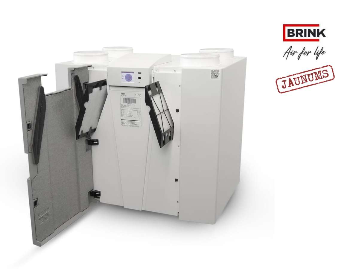 Tehniskie dati: Izmēri: P 800 x A 850 x Dz 661 (mm) Daisa vada pieslēgums: 200 mm Gaisa plūsma (pie 250 Pa): Maks. 450 m3/h Lietošanas diapazons no 50 m³/h līdz 450 m³/h Temperatūras efektivitāte PHI*: 92% Iebūvēts gaisa apvadvārsts (bypass) Iebūvēts āra gaisa priekšsildītājs: 1000w * PHI = Passive House Institūta sertifikāts BRINK Priekšrocības: